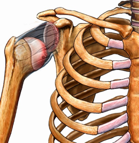 The shoulder (glenohumeral) joint is made up of 2 main bones: the humerus (upper arm) and the scapula (shoulder blade). The head of the humerus is ball shaped and fits into the glenoid cavity (a socket on the scapula). Surrounding the shoulder are various muscles, tendons and ligaments which help to support the shoulder and prevent instability.