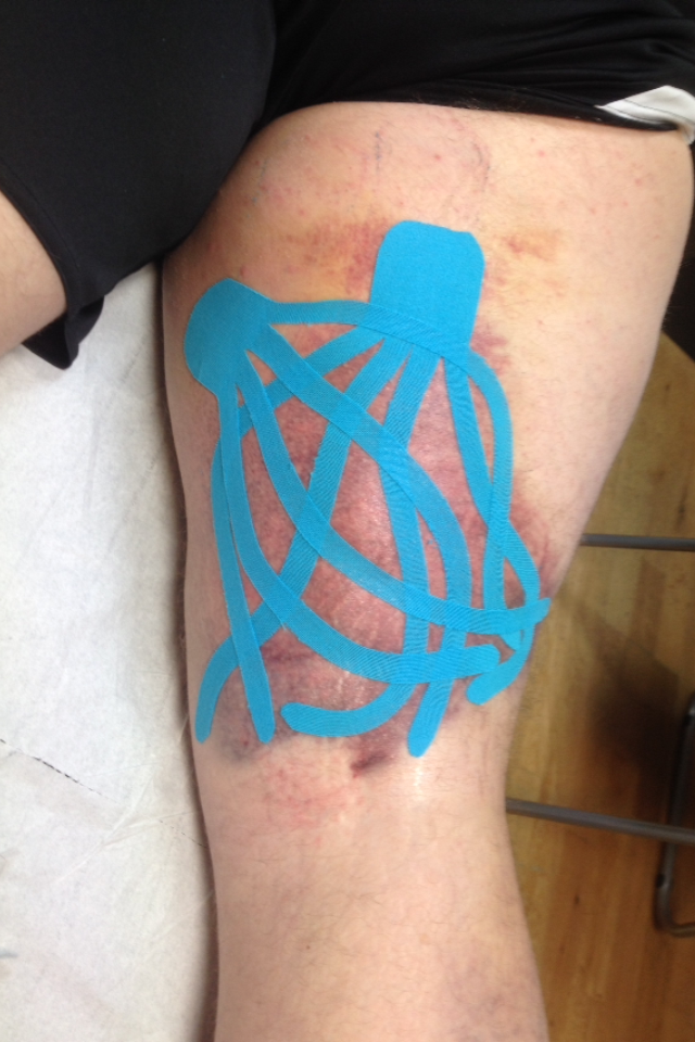 Initial treatment should aim to minimise haemorrhage and inflammation, therefore reducing pressure and pain at the site of injury. Treat with rest and ice initially and unload the limb if necessary to reduce muscle damage, prevent further bleeding, swelling and pain. Taping can be used from day 1 to encourage removal of fluid and bruising from the injured area.